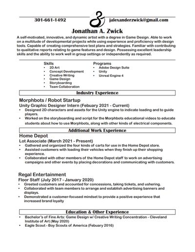 A self-motivated, innovative, and dynamic graduate professional with an academic background in Game Design and Creative Writing. Able to work on a multitude of developmental projects concurrently while utilizing experience and proficiency with design tools. Adept at enhancing the quality of projects and performing testing on various platforms. Capable of creating comprehensive test plans and strategies. Familiar with contributing to qualitative reports relating to game features and design. Possessing excellent leadership skills and the ability to work well in group settings or independently as required.